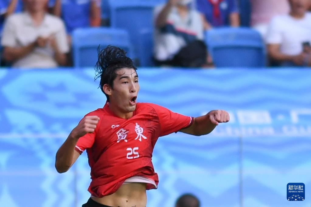 10月14日,南队广东队球员布尼亚明·阿不都沙拉木在比赛中庆祝进球。全运球男