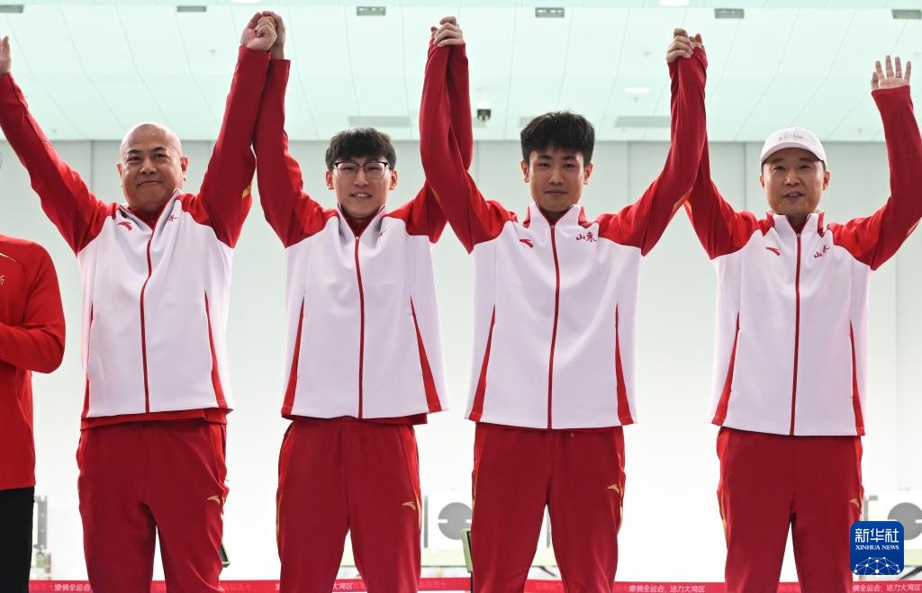 10月14日,射团赛赛冠军山东队选手李越宏、体决刘帅、全运枪速倪志欣(从右至左)和教练在颁奖仪式上庆祝。米手