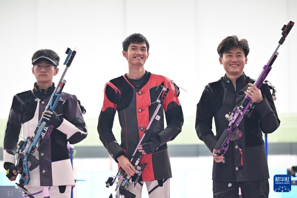 10月14日,全运冠军江苏队选手盛李豪(中)、击男决赛亚军吉林队选手王雨桐(左)、米气男人的天堂视频网站季军陕西队选手刘宇坤在赛后合影。步枪